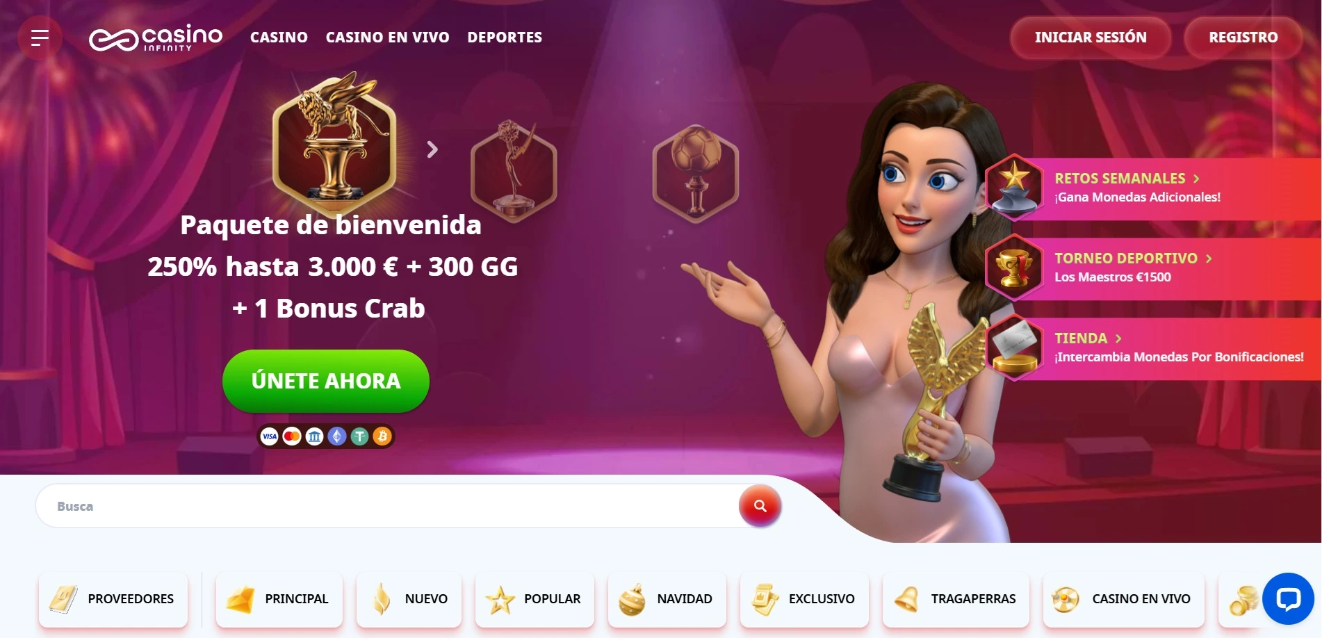 Su biblioteca roza los 8.000 juegos de más de 100 proveedores. Hay secciones dedicadas a megaways, jackpots progresivos y juegos exclusivos que no encuentras en otros sitios.