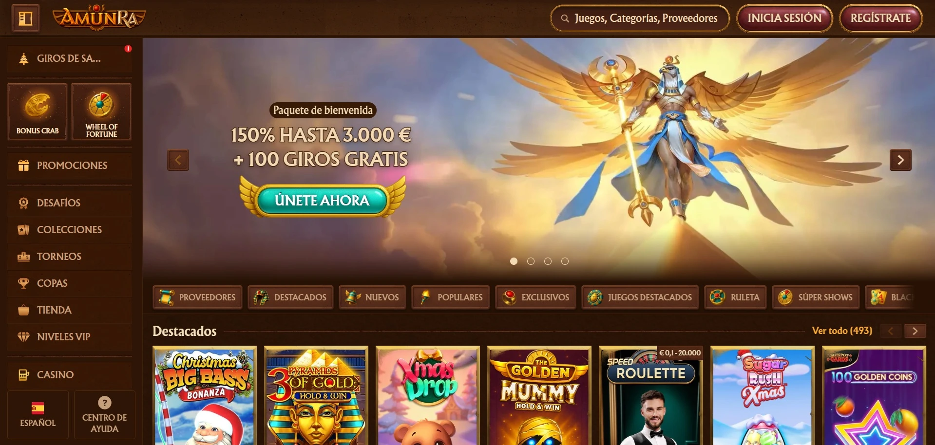 Amunra tiene una estética inspirada en el antiguo Egipto que lo hace reconocible al instante. Lleva operando desde 2020 y ha construido una base sólida de jugadores leales.